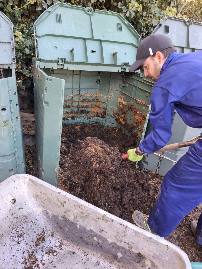 El suelo, el sustrato de nuestros bancales elevados, lo elaboramos nosotros mismos con los deshechos orgánicos de la cocina, del gallinero, de los restos de poda y hojas secas de nuestros almendros, y paja mezclada con el estiércol de las vacas de Aurelio; el ganadero del pueblo. Todo esto lo fermentamos, volteamos y maduramos durante meses en cuatro composteras, lo que nos resulta en 4.000kg de compost anuales, con el que aportamos materia orgánica y microorganismos al suelo de nuestro huerto. Durante el invierno aprovechamos el calor de la chimenea para la elaboración de biochar, normalmente con las cáscaras de los almendrucos y los corchos de las botellas de vino del restaurante, el cual incorporamos al compost en el proceso de maduración como enmienda para el suelo.